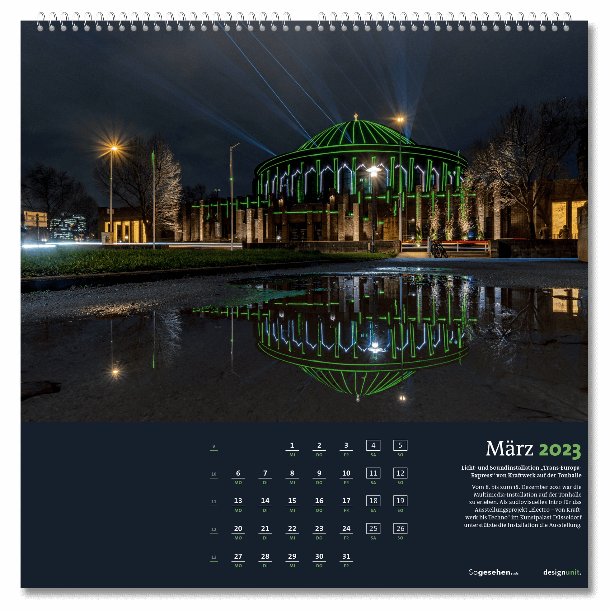 Bereits auf dem Cover unseres aktuellen Kalenders gibt es Düsseldorf satt. Der Schlossturm am Burgplatz gemeinsam mit dem Riesenrad und den Säulenheiligen auf der Füchschen-Litfass-Säule – mehr Düsseldorf geht kaum. Entstanden ist diese Aufnahme am „Orange Day“, dem Internationalen Tag gegen Gewalt an Frauen, der Ende November 2021 zum ersten Mal in Düsseldorf stattfand. Wir haben diese Mal versucht nicht nur ungewöhnliche Perspektiven zu finden, sondern auch einmalige Ereignisse festzuhalten. So findet sich zum Beispiel im März eine Aufnahme von der Multimedia-Aktion „Trans-Europa-Express“ vor dem NRW-Forum, bei der zu den Klängen von Kraftwerk eine Lichtshow auf die Tonhalle projeziert wurde.